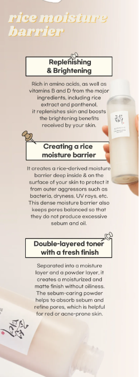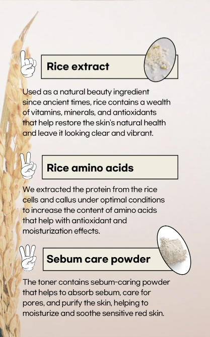 • Formulated with Rice Extract and Rice Amino Acids which enhance antioxidant and moisturizing effects to deeply hydrate dry skin and prevent skin from dehydration.